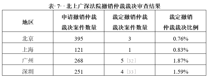 北上廣深法院的撤裁案件審查情況,如表7所示。
