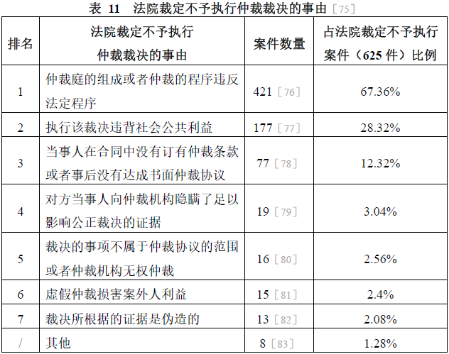 625件仲裁裁決被法院裁定不予執(zhí)行的有效樣本案件中,適用的事由如表11所示。
