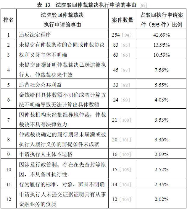 司法實(shí)踐中,法院在駁回仲裁裁決執(zhí)行申請(qǐng)時(shí),通常援引的法律依據(jù)有兩類:一是《仲裁裁決執(zhí)行規(guī)定》第三條、第四條,二是《最高人民法院關(guān)于人民法院執(zhí)行工作若干問(wèn)題的規(guī)定(試行)》第十八條(2020年修正后為第十六條)。2020年595件被裁定駁回執(zhí)行申請(qǐng)的案件所涉事由如表13所示。