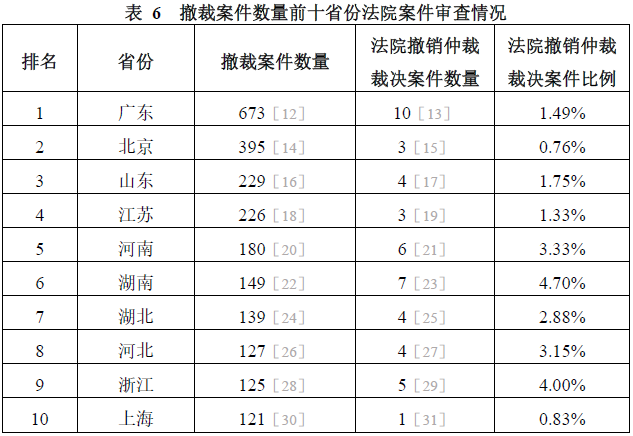 除去申請(qǐng)人撤回申請(qǐng)、法院按申請(qǐng)人撤回申請(qǐng)?zhí)幚砑安门形臅?shū)未公開(kāi)的案件外,我們對(duì)有效樣本案件進(jìn)行統(tǒng)計(jì),梳理了撤裁案件數(shù)量排名前十省份的案件審查情況。其中5個(gè)省份裁定撤銷裁決的案件比例高于全國(guó)水平(2.25%),分別為湖南(4.70%)、浙江(4%)、河南(3.33%)、河北(3.15%)、湖北(2.88%);其余5個(gè)省份裁定撤銷裁決的案件比例較低,分別為山東(1.75%)、廣東(1.49%)、江蘇(1.33%)、上海(0.83%)、北京(0.76%)。具體情況如表6所示。