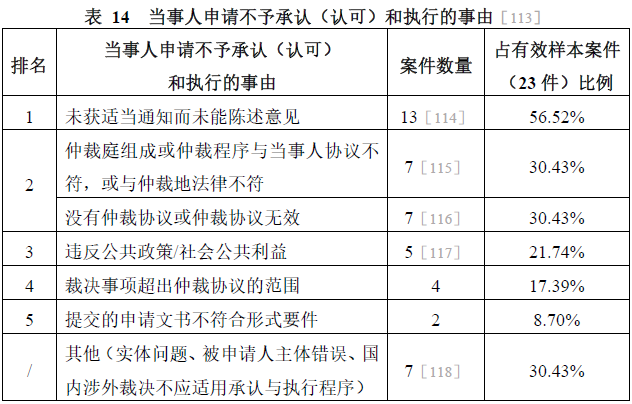 該26件案件中,申請(qǐng)承認(rèn)和/或執(zhí)行外國(guó)仲裁裁決案件20件,申請(qǐng)認(rèn)可和/或執(zhí)行香港地區(qū)仲裁裁決案件6件,未見(jiàn)申請(qǐng)認(rèn)可和/或執(zhí)行臺(tái)灣地區(qū)、澳門(mén)地區(qū)仲裁裁決案件。剔除3件串案后的有效樣本案件數(shù)量為23件。當(dāng)事人申請(qǐng)不予承認(rèn)(認(rèn)可)和執(zhí)行的事由如表14所示。