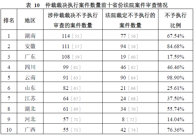 關(guān)于仲裁裁決的不予執(zhí)行審查,從啟動(dòng)主體看,案外人申請(qǐng)不予執(zhí)行的案件總量為105件[51],最終被裁定不予執(zhí)行的案件有15件[52],占比約為14.29%。[53]從地域分布看,全國(guó)各省市區(qū)均有有效樣本案件,其中北京、青海、西藏三地未檢索到被裁定不予執(zhí)行的案件(不排除存在數(shù)據(jù)庫(kù)收錄不全、文書(shū)未完全公開(kāi)等情況)。云南、甘肅、安徽等11個(gè)省份的不予執(zhí)行比例在50%以上,高于全國(guó)平均比例47.35%。[54]前述省份不予執(zhí)行比例畸高主要系因存在大量申請(qǐng)執(zhí)行網(wǎng)絡(luò)借貸仲裁裁決案件,以排名第一的云南為例,90件被裁定不予執(zhí)行的案件中有56件與網(wǎng)絡(luò)借貸有關(guān)。涉仲裁裁決不予執(zhí)行審查案件數(shù)量排名前十的省份具體情況如表10所示。
