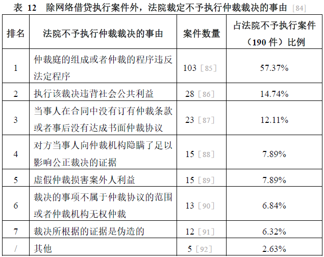除網(wǎng)絡(luò)借貸仲裁裁決執(zhí)行案件外,被裁定不予執(zhí)行的190件案件所涉事由見(jiàn)表12。從中可見(jiàn),違反法定程序是仲裁裁決被裁定不予執(zhí)行最為常見(jiàn)的事由。