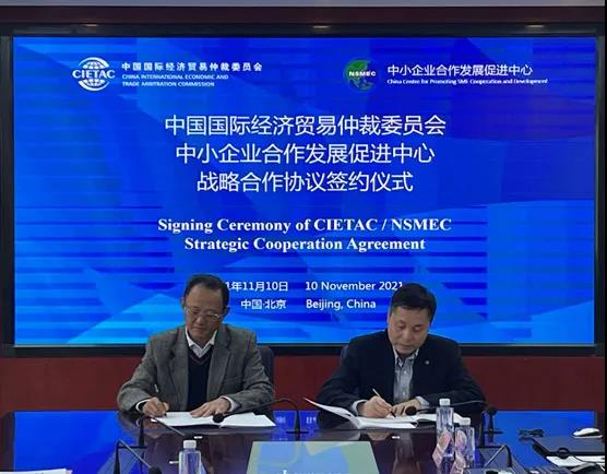 2021年11月10日,中國國際經(jīng)濟(jì)貿(mào)易仲裁委員會(huì)(“貿(mào)仲”)與中小企業(yè)合作發(fā)展促進(jìn)中心(“中促中心”)戰(zhàn)略合作協(xié)議簽約儀式在北京成功舉行。貿(mào)仲王承杰副主任兼秘書長、中促中心黎志明主任代表雙方在戰(zhàn)略合作協(xié)議上簽字。