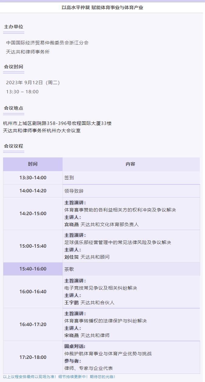 今年6月24日,新修訂的《中華人民共和國體育法》頒布一周年。一年來,我國體育仲裁與體育商事仲裁事業(yè)雙雙迎來快速發(fā)展。值此杭州亞運會盛大召開之際,現(xiàn)擬在第十一屆中國仲裁周期間舉辦專場論壇,深度探討如何以高水平仲裁,賦能體育事業(yè)與體育產(chǎn)業(yè),探索體育糾紛及體育相關(guān)商事糾紛解決路徑,為我國的體育事業(yè)和產(chǎn)業(yè)發(fā)展提供法律視角、貢獻專業(yè)智慧。