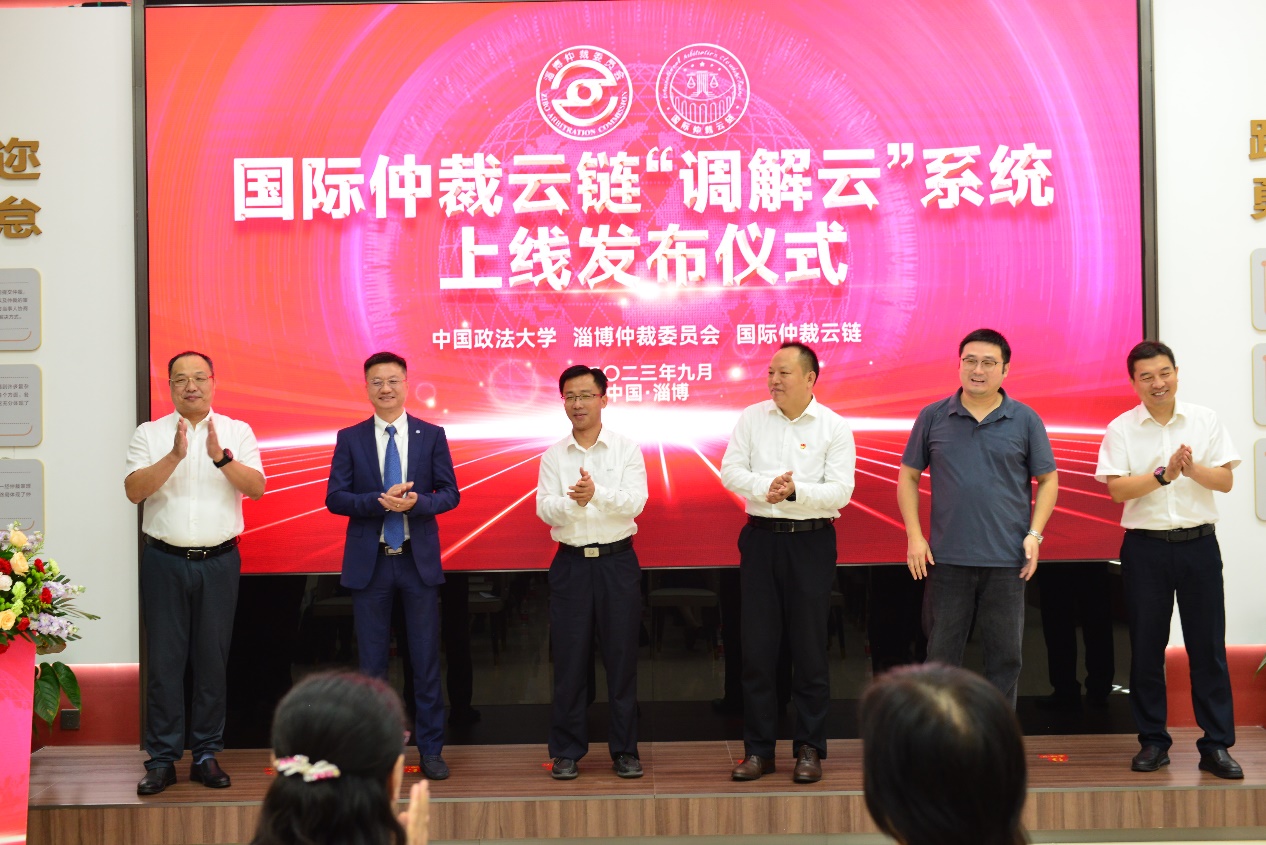 山東省司法廳一級調研員李世敏,淄博仲裁辦黨組書記、主任張公博,淄博仲裁辦黨組成員、副主任閆世學,中國政法大學副教授、國際仲裁云鏈理事會副理事長周蔚,中國政法大學網絡安全和信息化辦公室副主任張軼舸,泰杭律師事務所主任、國際仲裁云鏈理事會理事汪政共同為調解云系統(tǒng)上線揭牌。