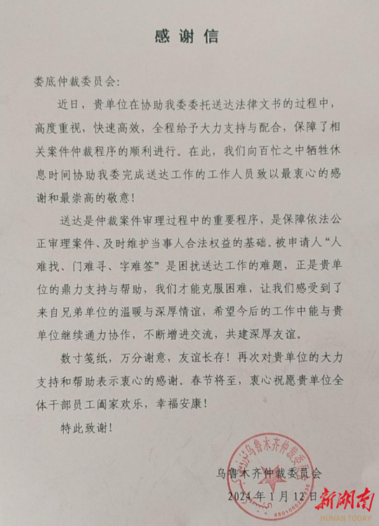 1月19日,婁底仲裁委員會收到烏魯木齊仲裁委員會發(fā)來的感謝信,信中對婁底仲裁委員會為協(xié)助烏魯木齊仲裁委員會送達法律文書所做的工作表示感謝。