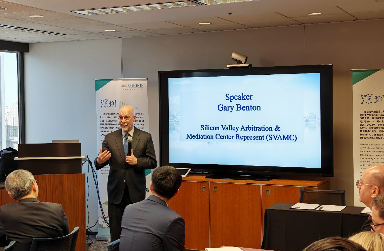 深國仲院長劉曉春在歡迎辭中分享了國際仲裁在中國深圳經(jīng)濟特區(qū)的最新發(fā)展和規(guī)則創(chuàng)新。中國駐舊金山總領事館商務參贊鄔沛民到場祝賀,他表示以深國仲為代表的高水平國際商事仲裁將為中美兩國經(jīng)貿交往提供更為穩(wěn)定的預期。深圳市駐北美經(jīng)貿代表處首席代表于智榮介紹深圳的最新發(fā)展與投資機遇。硅谷國際仲裁調解中心主席加里·本頓致辭,表示希望與深國仲加強合作,共同促進舊金山灣區(qū)與粵港澳大灣區(qū)的企業(yè)交流。美國司法仲裁與調解機構總裁克里斯·普爾回顧了與深國仲的多年合作歷史,并期待進一步的合作。深國仲國際合作與發(fā)展處處長兼深國仲江門中心主任黃郭勇主持活動。