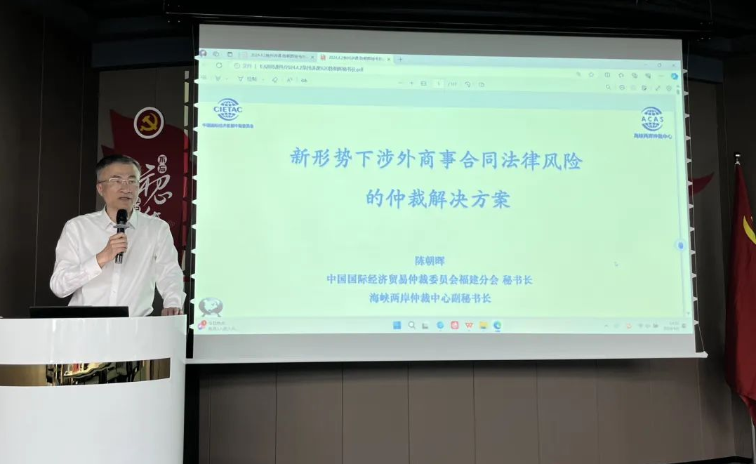 活動(dòng)中,海峽兩岸仲裁中心副秘書(shū)長(zhǎng)、中國(guó)國(guó)際經(jīng)濟(jì)貿(mào)易仲裁委員會(huì)福建分會(huì)秘書(shū)長(zhǎng)陳朝暉以“新形勢(shì)下涉外商事合同法律風(fēng)險(xiǎn)的仲裁解決方案”為題,結(jié)合大量實(shí)務(wù)案例,幫助企業(yè)了解國(guó)際商事合同常見(jiàn)法律風(fēng)險(xiǎn)點(diǎn),并指導(dǎo)企業(yè)靈活運(yùn)用國(guó)際商事仲裁這一涉外商事?tīng)?zhēng)議的有效解決方式。