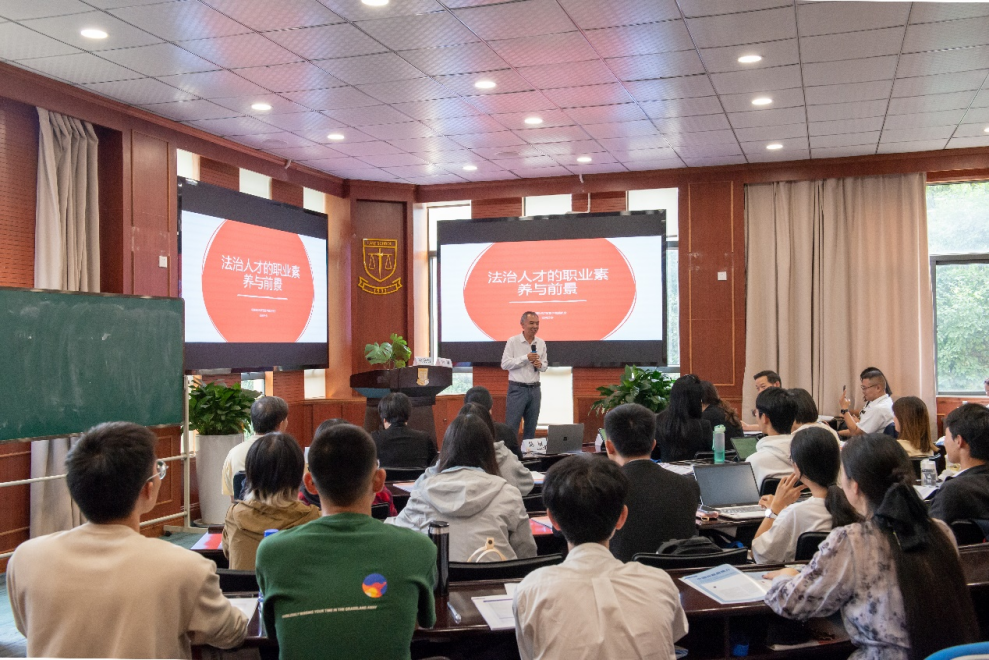 原美的集團全球法務總監(jiān)、貿仲仲裁員陳敏作專題演講。陳敏談到,法治人才的職業(yè)素養(yǎng)并不是一種知識,而是一種訓練,法學院的學生應當具備的職業(yè)素養(yǎng)包括樹立證據意識、做事留痕、具備批判思維和審慎品質等。法治人才的難得在于不但需要有扎實的法律知識,還需要具備更多其他行業(yè)的基礎知識,必須有意識地突破自己的職業(yè)局限,多方面培養(yǎng)自己的知識體系。他還以網絡熱詞為例,談論了目前的社會就業(yè)情況及學子們進入職場后可能會遇到的問題,并給出了解決方式和建議。最后,他以“主動權,決定生存權”作為結束語,呼吁學子們厚積薄發(fā),主動把握未來。