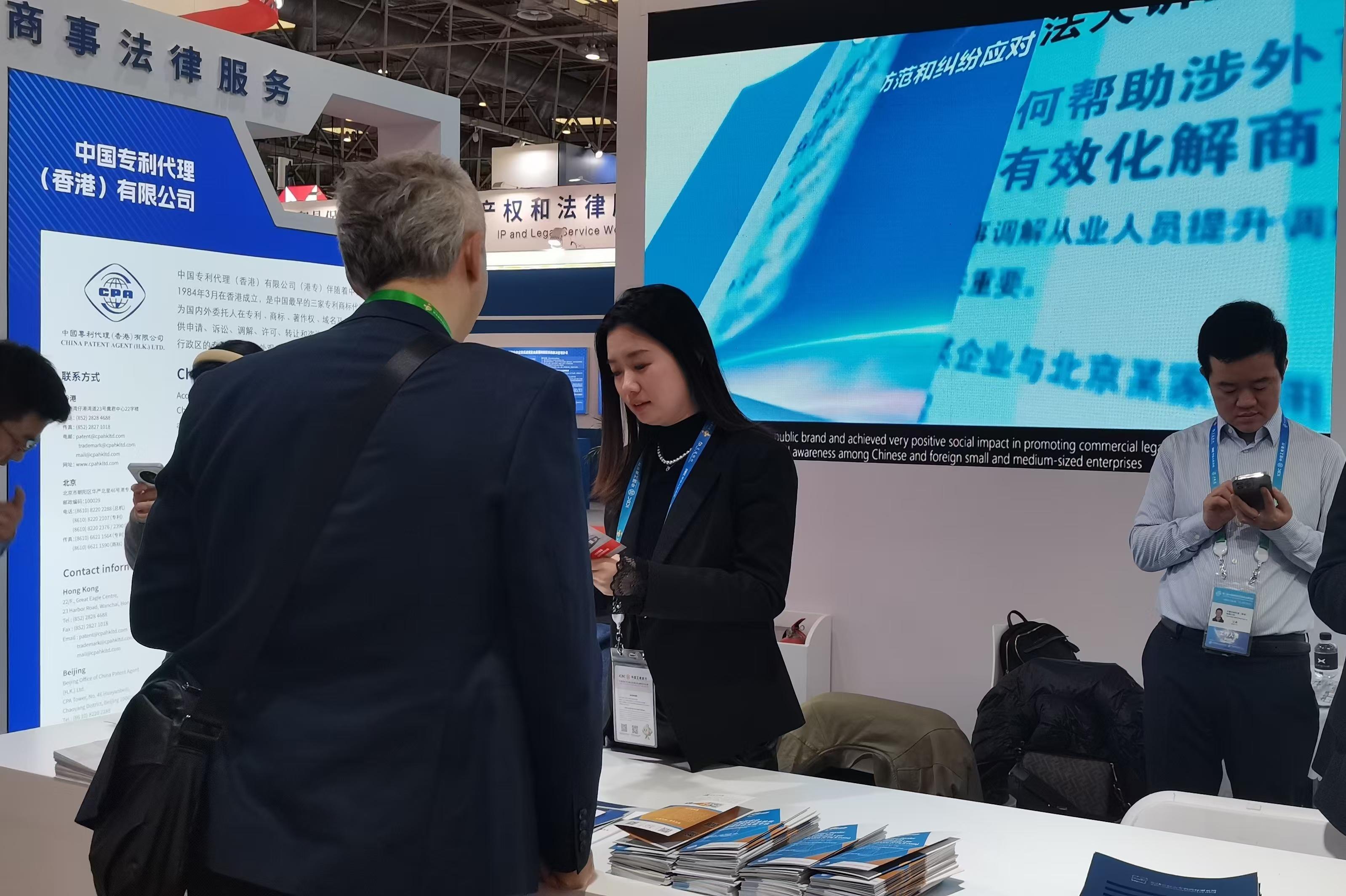 緊鄰這一展臺的,同樣是法律類機構或組織,他們也在這次鏈博會上承擔著相關工作任務。例如,中國貿(mào)促會會同北京市知識產(chǎn)權局、順義區(qū)市場監(jiān)管局等單位,設立知識產(chǎn)權和法律服務工作站,多家機構專業(yè)人員進駐,開設專利和商標申請受理窗口,建立知識產(chǎn)權糾紛快速處理機制。