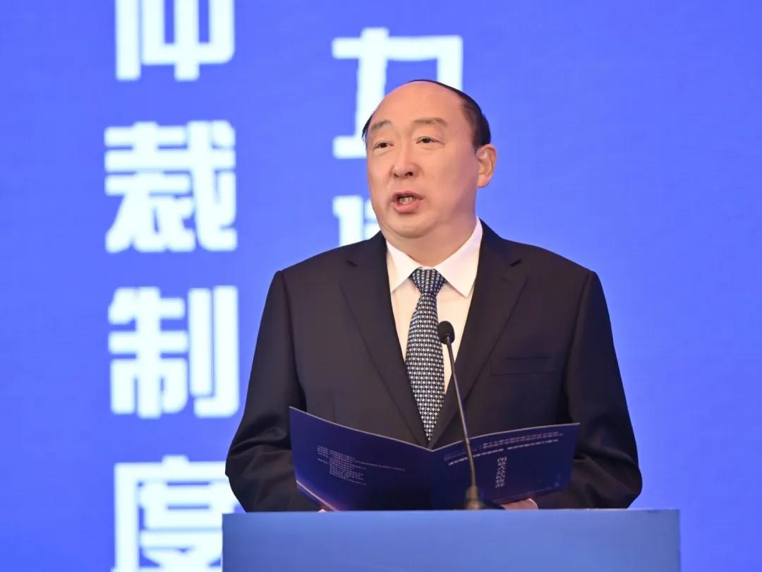 (中國國際貿易促進委員會黨組成員、副會長、中國仲裁法學研究會會長于健龍作開幕致辭)