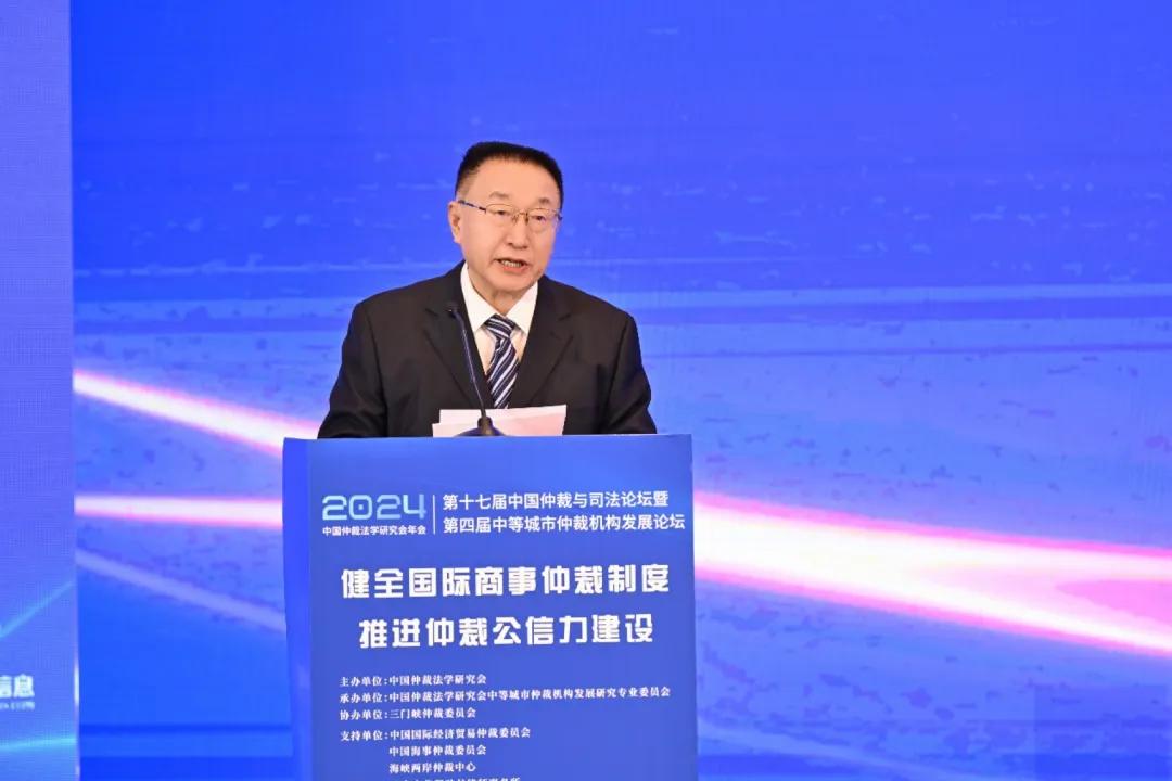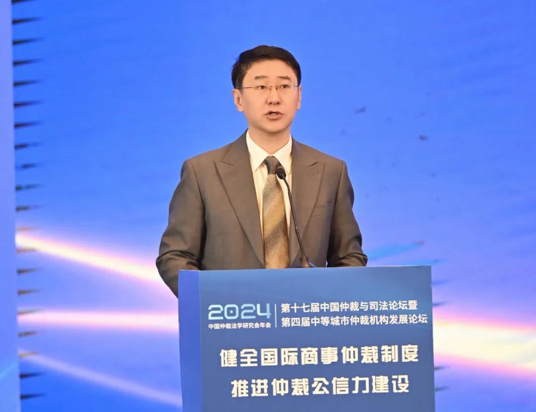 (中國(guó)國(guó)際貿(mào)易促進(jìn)委員會(huì)黨組成員、副會(huì)長(zhǎng)、中國(guó)仲裁法學(xué)研究會(huì)會(huì)長(zhǎng)于健龍作開幕致辭)