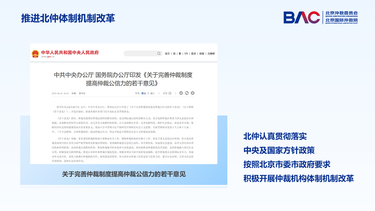 北仲認(rèn)真貫徹落實(shí)中央及國家方針政策,按照北京市委市政府要求積極開展了仲裁機(jī)構(gòu)體制機(jī)制改革。