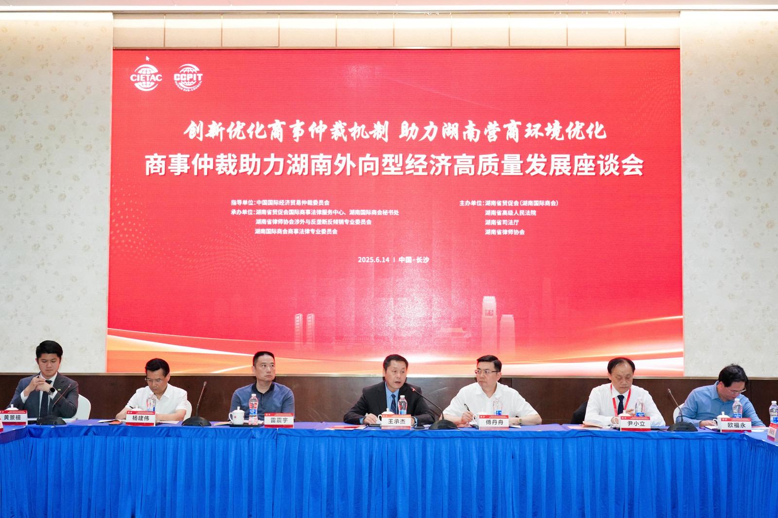 6月14日,商事仲裁助力湖南外向型經(jīng)濟高質(zhì)量發(fā)展座談會在湖南省長沙市成功舉辦。本次座談會由中國國際經(jīng)濟貿(mào)易仲裁委員會(簡稱貿(mào)仲)指導(dǎo),湖南省貿(mào)促會(湖南國際商會)、湖南省高級人民法院、湖南省司法廳、湖南省律師協(xié)會共同主辦。貿(mào)仲副主任兼秘書長王承杰、湖南省司法廳副廳長雷震宇、湖南省高級人民法院審判委員會專職委員尹小立、湖南省律師協(xié)會會長楊建偉、澳門法律交流協(xié)進會會長黃景禧以及湖南師范大學法學院副院長歐福永參加座談會并講話。湖南省貿(mào)促會黨組成員、副會長傅丹舟主持座談會。來自湖南省重點涉外企業(yè)及律師事務(wù)所的負責人和資深專家以及來自政府部門、行業(yè)協(xié)會、高校共40余位代表參加了座談會。