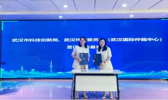 武漢市科技創(chuàng)新局黨組書記、局長(zhǎng)董丹紅和武漢仲裁委辦黨組書記、主任羅平分別代表雙方單位簽署合作備忘錄。