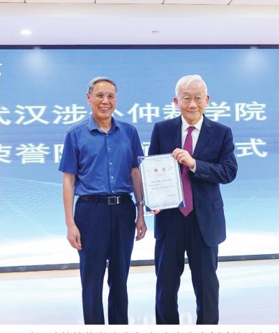 武漢涉外仲裁學(xué)院成立,楊良宜先生(右)接過(guò)名譽(yù)院長(zhǎng)聘書。