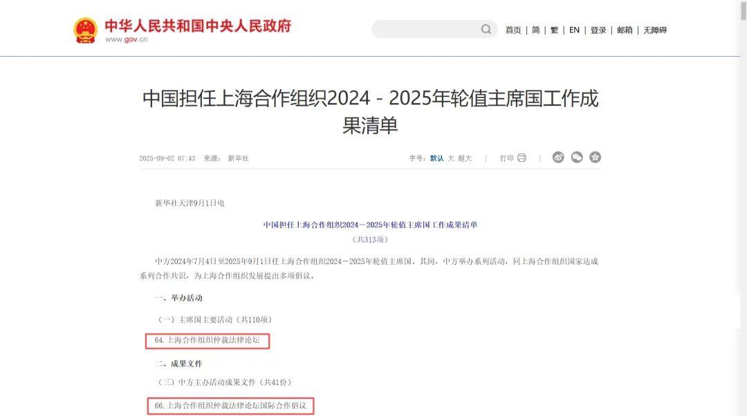 9月1日,上海合作組織成員國元首理事會第二十五次會議在天津順利召開。外交部發(fā)布《中國擔任上海合作組織2024-2025年輪值主席國工作成果清單》(以下簡稱《成果清單》),中國國際經(jīng)濟貿(mào)易仲裁委員會(以下簡稱貿(mào)仲)兩項成果收錄其中。由貿(mào)仲主辦的“上合組織仲裁法律論壇”,被列入《成果清單》“主席國主要活動”(第64項)。論壇所發(fā)布的《上合組織仲裁法律論壇國際合作倡議》被列入《成果清單》“中方主辦活動成果文件”(第66項)。