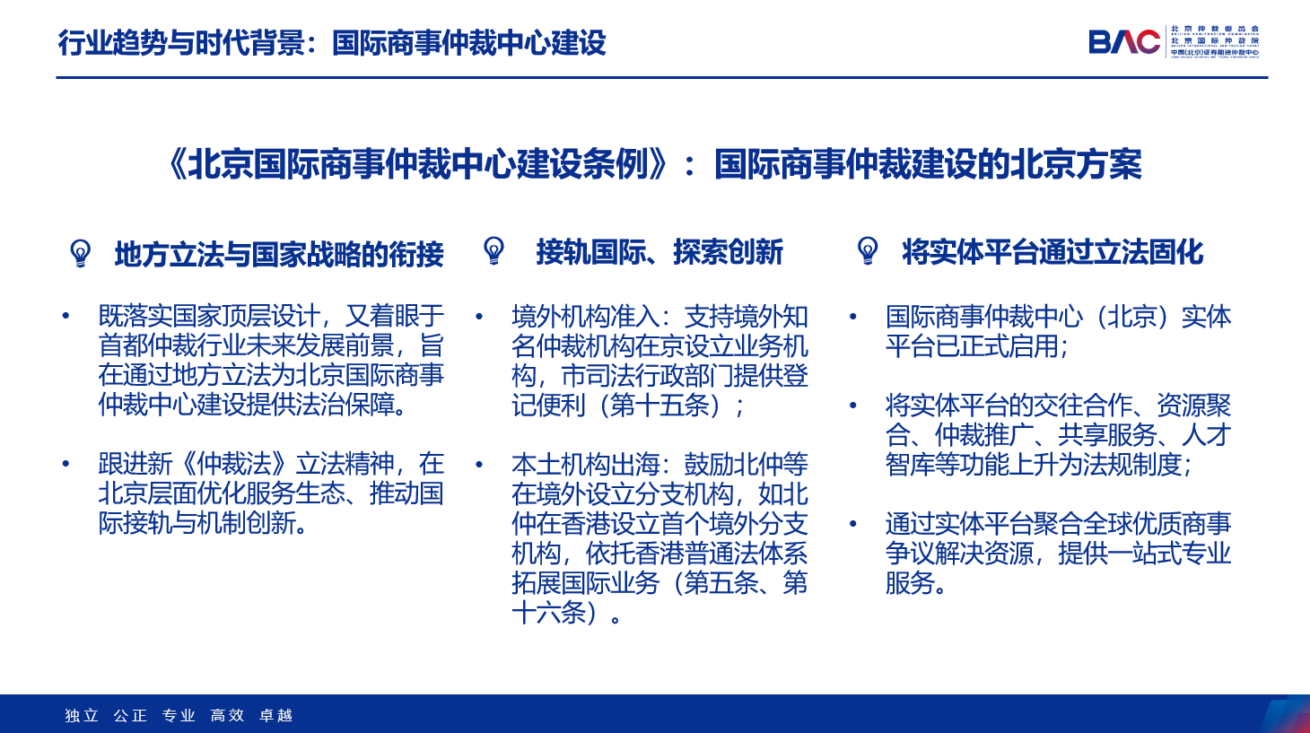 《條例》于2025年9月26日經(jīng)北京市十六屆人大常委會(huì)第十九次會(huì)議表決通過(guò),提出了國(guó)際商事仲裁中心建設(shè)的總體要求,包括優(yōu)化仲裁發(fā)展環(huán)境,支持仲裁改革創(chuàng)新,建設(shè)仲裁制度接軌國(guó)際、資源優(yōu)質(zhì)集聚、機(jī)構(gòu)國(guó)際一流、服務(wù)專(zhuān)業(yè)高效、司法保障優(yōu)良的國(guó)際商事仲裁中心,旨在打造國(guó)際商事?tīng)?zhēng)議解決和法律服務(wù)優(yōu)選地,提升涉外法治保障和服務(wù)水平,助力北京營(yíng)造市場(chǎng)化、法治化、國(guó)際化一流營(yíng)商環(huán)境。