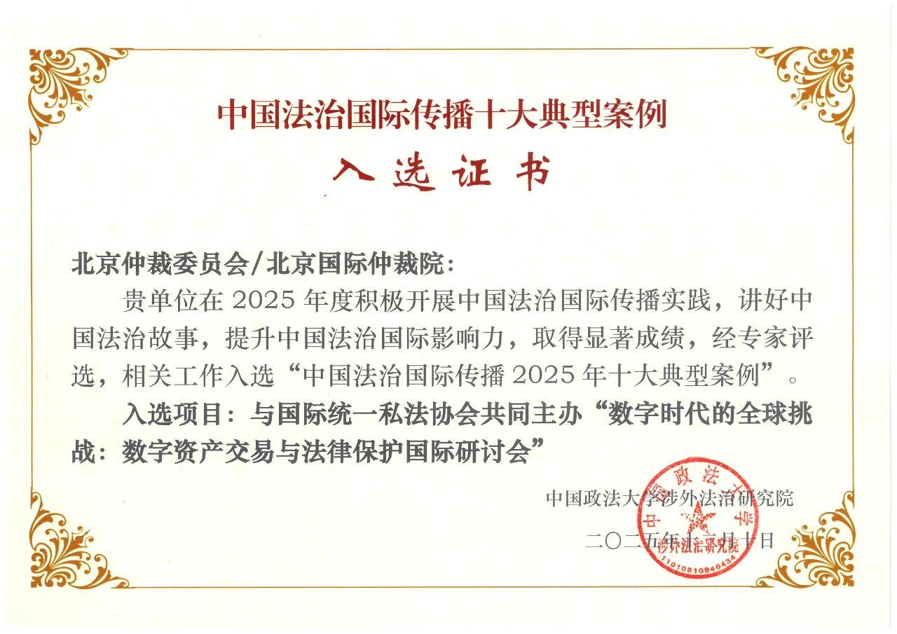 為加強(qiáng)中國(guó)法治的國(guó)際傳播,統(tǒng)籌推進(jìn)國(guó)內(nèi)法治與涉外法治,中國(guó)政法大學(xué)涉外法治研究院組織評(píng)選并發(fā)布了2025年“中國(guó)法治國(guó)際傳播十大典型案例”。北京仲裁委員會(huì)/北京國(guó)際仲裁院/中國(guó)(北京)證券期貨仲裁中心(以下稱“北仲”)與國(guó)際統(tǒng)一私法協(xié)會(huì)(UNIDROIT)、北京國(guó)際爭(zhēng)議解決發(fā)展中心共同主辦的“數(shù)字時(shí)代的全球挑戰(zhàn):數(shù)字資產(chǎn)交易與法律保護(hù)”國(guó)際研討會(huì)成功入選。這是繼2020年北仲舉辦的中國(guó)商事?tīng)?zhēng)議解決年度觀察海外發(fā)布會(huì)入選2020“中國(guó)法治國(guó)際傳播十大典型案例”后,北仲實(shí)踐再次入選。