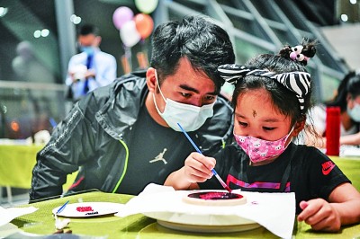 成都博物館,家長(zhǎng)帶小朋友在夜間體驗(yàn)成都漆器制作。新華社發(fā)