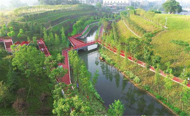 2021年,九龍坡區(qū)再度啟動跳磴河(9條支流)“清水綠岸”治理提升工程,整治完善9條支流及城鄉(xiāng)接合部排水管網(wǎng),對薄弱段河道進行生態(tài)修復,啟動海綿公園及廣場建設(shè),建設(shè)面源污染控制設(shè)施。同步啟動流域內(nèi)支流生態(tài)護岸建設(shè)、中梁山及各周邊公園地塊至跳磴河健身步道串聯(lián)更新等,全域水環(huán)境和人居環(huán)境質(zhì)量不斷提升。