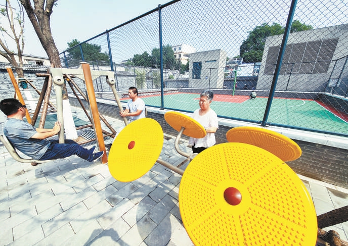 走出平安里地鐵站,原本空曠的街邊廣場座椅與健身器材錯(cuò)落有致,街道空間真正變成了居民的“城市客廳”。 本報(bào)記者 方非攝