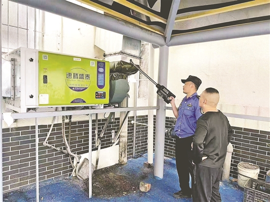 執(zhí)法人員檢查油煙凈化設備使用情況。
