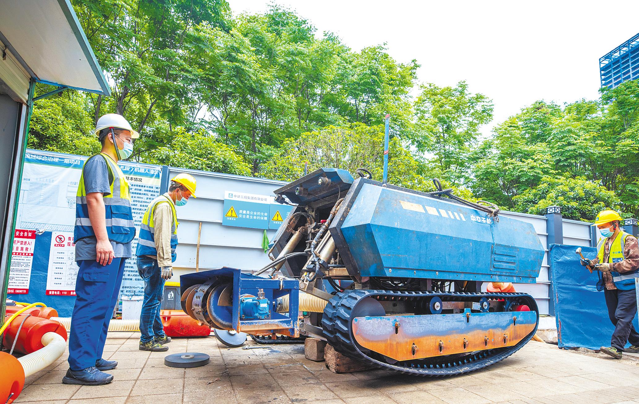 這就是中建三局綠投公司自主研發(fā)的巡檢機(jī)器人,配有“有限空間安全作業(yè)智慧管控系統(tǒng)”,還有“四竅”,即四個(gè)可轉(zhuǎn)換、以便調(diào)節(jié)暗涵內(nèi)空氣的通風(fēng)、送風(fēng)井;來(lái)水擋板,高強(qiáng)度鋁合金制成、能防瞬時(shí)涌水;智慧門禁,管控進(jìn)入暗涵作業(yè)人員身份等。目前,該公司正在二次研發(fā),進(jìn)一步提高機(jī)器人的性能,以適應(yīng)更多場(chǎng)景。
