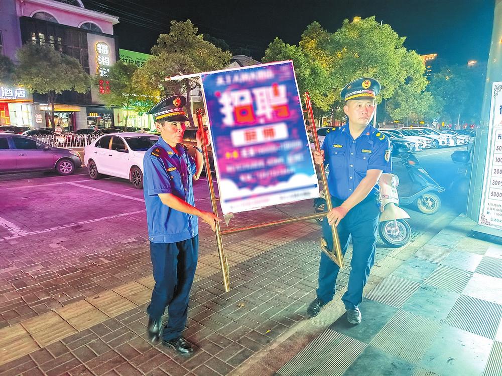 夏季是夜宵燒烤攤點店外經(jīng)營、流動瓜果散販增多的高峰季節(jié),使得夜間城市管理難度加大?!袄习?,廣告牌不能占道擺放,我們幫您搬進店內(nèi)!”8月25日晚8點,夜幕來臨,在磨子山南路,路燈照亮了岳陽樓區(qū)城管委城管三大隊執(zhí)法隊員忙碌的身影,他們正在對夜間人流量較大、群眾反復(fù)投訴的重點難點路段和區(qū)域進行巡查管控,嚴(yán)防夜市出店經(jīng)營、露天燒烤、油煙污染及夜間施工場地揚塵污染、違規(guī)渣土車無證運輸?shù)葐栴}發(fā)生。