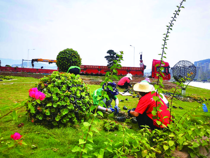 日前,記者在王牌路口節(jié)點(diǎn)看到,園林工人們正在這里換種鮮花,將草坪中間造型上布滿四季海棠,讓鮮花形成鮮艷的花球。在天仙湖攔砂壩,鞍式花箱中替換成了太陽花,花朵盛開嬌艷美麗,與仍在綻放的三角梅相映成趣,在城市高樓長街、萬安大橋、一江碧水的大背景下自成風(fēng)景線。