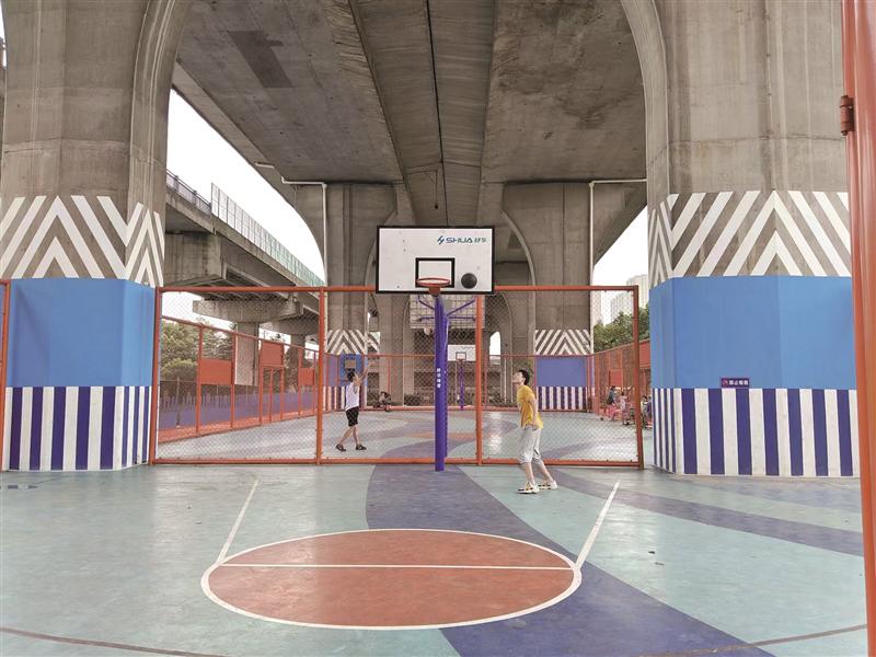 “高架樂(lè)園”不僅配備了嶄新的籃球場(chǎng)、棋牌廣場(chǎng)、文化舞臺(tái)、滑板場(chǎng)、乒乓球場(chǎng)、健身步道等文體設(shè)施,還在環(huán)境裝飾上融入泰伯藝術(shù)元素、新吳文化特征。經(jīng)過(guò)一番裝扮、布置,橋下變成了充滿活力的多彩走廊,明亮熱鬧的體育健身、文娛交流場(chǎng)所?!案脑旌螅瑯蛳抡w環(huán)境提升了。”每天都到“高架樂(lè)園”練習(xí)跳舞的市民陳松開心地告訴記者,“政府為百姓辦了一件實(shí)篤篤的大好事。”