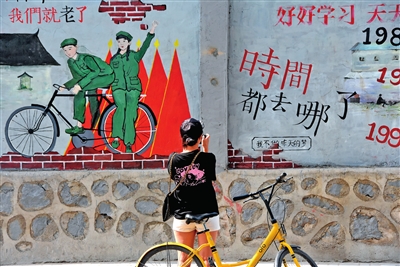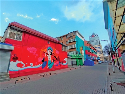 除了火紅的色彩外,巷子兩側(cè)老居民樓的外墻上,還繪了藍(lán)色的熊貓、橘紅的鹿、黃色的長(zhǎng)頸鹿和航天科幻作品,以及上世紀(jì)七八十年代的理發(fā)店、小賣部。整條巷子看上去色彩斑斕。常住于此的市民韓巍東說(shuō),多年來(lái),這條巷子給他的感覺(jué)是破舊、灰色的,但去年的這些改變,讓他日日走過(guò)的老巷,變得充滿活力和生機(jī),住在這里的人們,臉上也多了幾分笑意。
