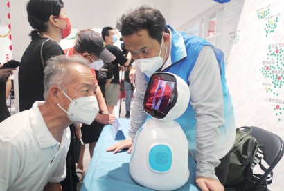 “醫(yī)加醫(yī)健康機(jī)器人”入駐普陀區(qū)部分居民區(qū),護(hù)衛(wèi)居民健康。該機(jī)器人”具有24小時(shí)在線診療、互聯(lián)網(wǎng)醫(yī)院門診預(yù)約、慢病配藥等為老服務(wù)功能。 攝影/張龍