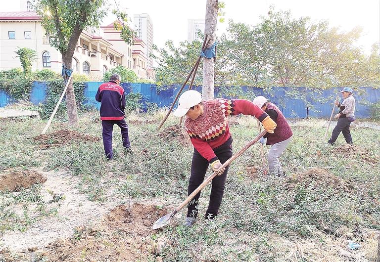 工作人員在路邊綠地內補栽綠植(本報記者 鄧嫻 攝)