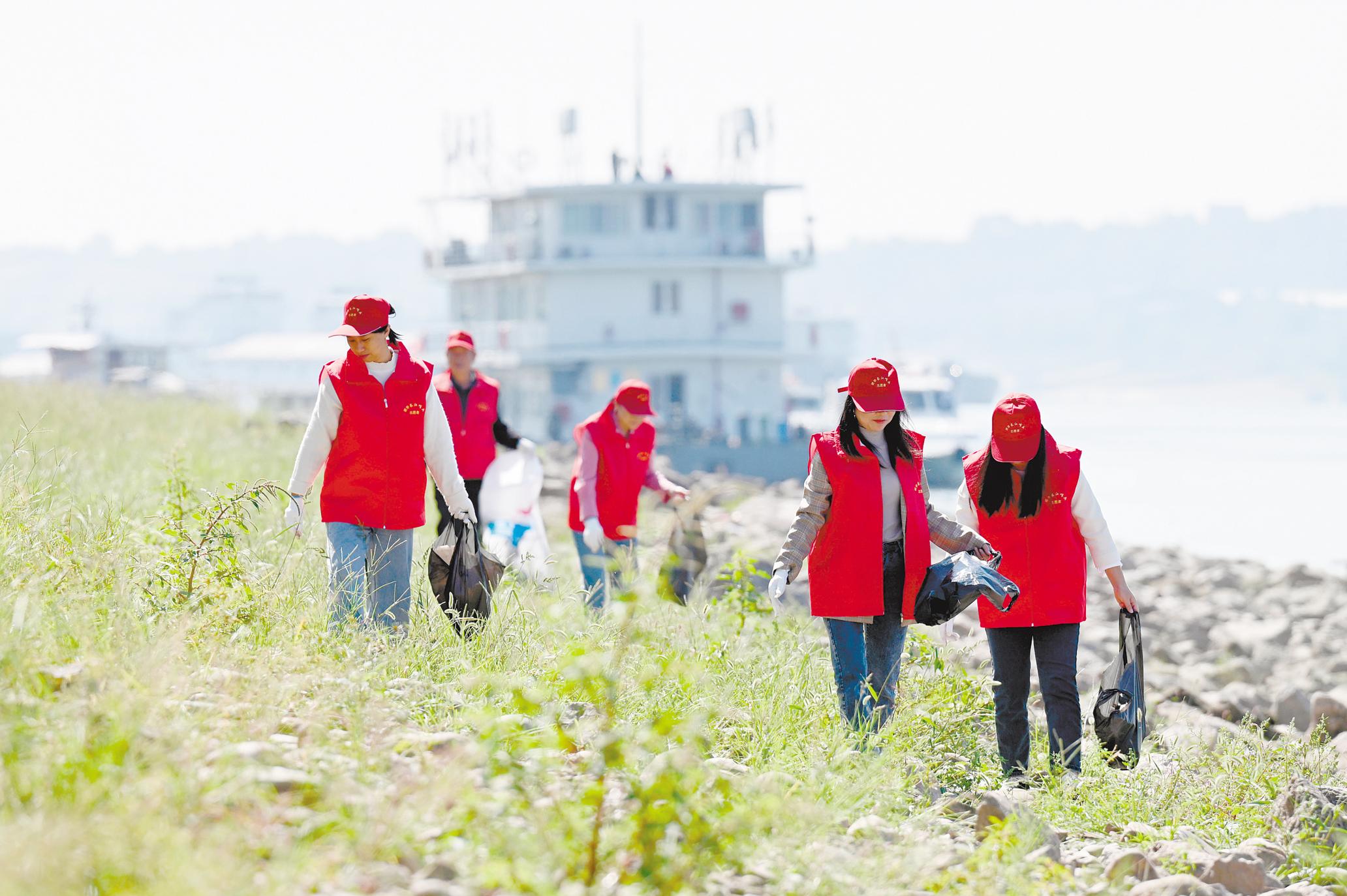 宜昌猇亭長(zhǎng)江邊呵護(hù)長(zhǎng)江岸線的青年志愿者。