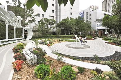在位于靜安區(qū)膠州路安遠路交叉口的“音花園”,無障礙步道的鋪設(shè)給腿腳不便,使用嬰兒車、輪椅的市民帶去舒適與便利。視覺中國供圖
