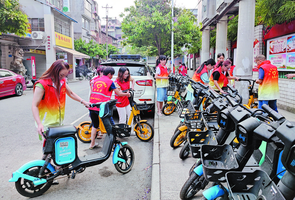 志愿者將街頭亂停亂放的共享單車擺放好。
