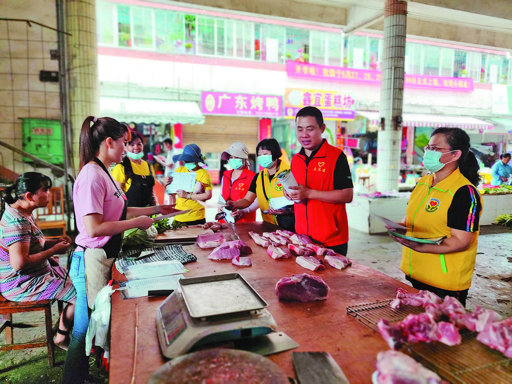 志愿者到農(nóng)貿(mào)市場宣傳創(chuàng)城工作。