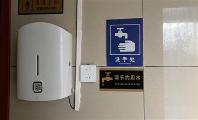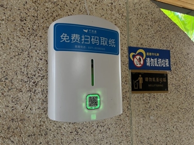 市民章小姐拿出手機掃描取紙機上的二維碼,數(shù)秒鐘機器便“吐”出長長的衛(wèi)生紙。洗手時將手放在洗手液盒下方,無需接觸,感應(yīng)出液。