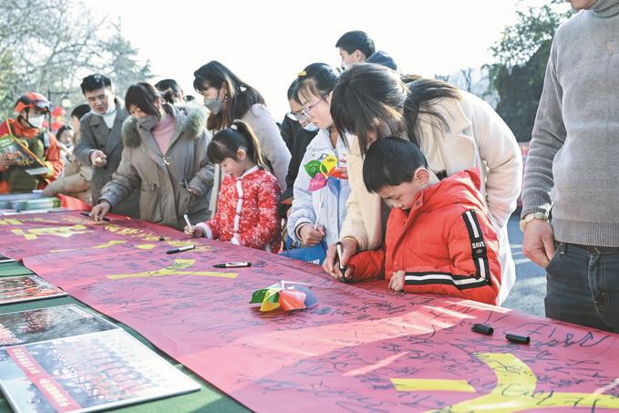 參加廟會的游客在“森林防火 人人有責(zé)”主題宣傳橫幅上簽字。 徐 浩 攝