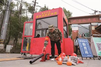 在東耕村吹臺山索道,記者看到了一個紅色的核酸小屋。湊近看,小屋里擺放著滅火器、阻燃服、2號打火棒等等滅火設(shè)備。