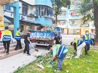 社區(qū)服務(wù)隊(duì)和居民一起清理垃圾。 記者 趙梓 攝