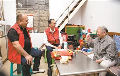 郭耀全(左)和楊學(xué)智(中)夜訪民情,來到榕桂街看望郭婆婆。(記者 莊小龍 攝)
