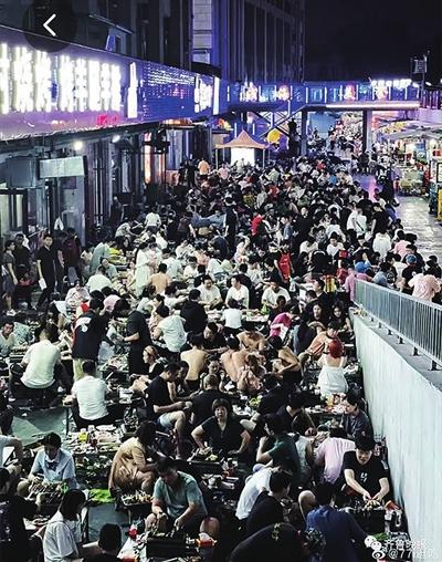 在熱門打卡地,大約晚上7時(shí),燒烤店門口排了幾百米的長龍,有人帶著馬扎,還有人帶著零食,交警在街頭路口維持秩序。來自江蘇的游客說:“當(dāng)?shù)嘏笥严挛?時(shí)多就來幫忙排隊(duì)了,現(xiàn)在終于吃上了?!辈灰粫?huì)兒,燒烤店負(fù)責(zé)人拿起了小喇叭:“手里沒菜單的別排隊(duì)了,店里沒肉了。”