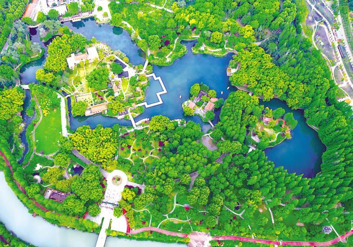 5月7日,鳥瞰武漢市青山公園,綠樹成蔭,生機(jī)勃勃。近年來(lái),武漢市青山區(qū)加大生態(tài)文明建設(shè),昔日“灰城”展露青翠面容,近五年建成11座公園,人均公園綠地面積位居武漢前列。(記者 朱熙勇 攝)