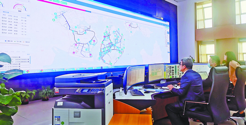 在廈門市政水務(wù)集團調(diào)度中心,工作人員通過供水管網(wǎng)實時仿真系統(tǒng),就能掌握管網(wǎng)運行狀態(tài)。(廈門市政水務(wù)集團 供圖)