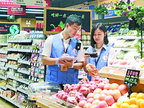 檢驗(yàn)人員對(duì)商超銷(xiāo)售的果蔬進(jìn)行抽檢。