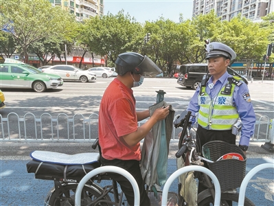 “騎乘電動(dòng)自行車,一定要正確戴安全頭盔,下次要記住了?!睌?shù)名未佩戴頭盔的電動(dòng)自行車駕駛?cè)吮粓?zhí)勤交警進(jìn)行口頭教育。其中,一名男子拿出頭盔簡(jiǎn)單戴上后便想離開,被眼尖的交警一把攔住。