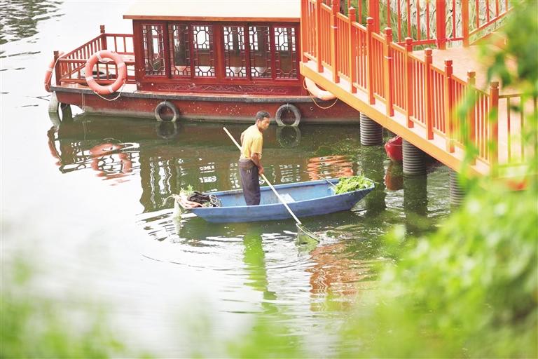 近日,黔南州福泉市金山體育生態(tài)公園沙河河段,河道保潔員正在打撈河面漂浮物。近年來,福泉市在做好河湖水質(zhì)監(jiān)測的同時,組織專、兼職人員開展河湖水道清理工作,不斷改善水質(zhì)和生態(tài)環(huán)境。(黃歡 攝)